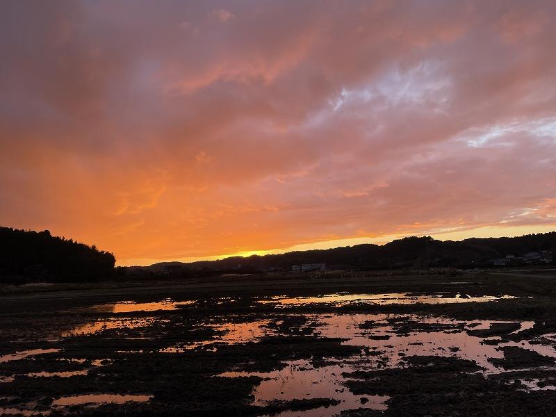 先週の夕日です。翌日は、晴れそうですね。この頃、田んぼの水辺に夕日が色づいていることがあります。奇麗なオレンジ色でいいですよ。里山は、毎日違う風景と出会える嬉しさがあります。でも、人口減少のため人とはなかなか会えないのです。その代わり、キョンとはたくさん会うことができます。可愛い顔をしているのですがね。